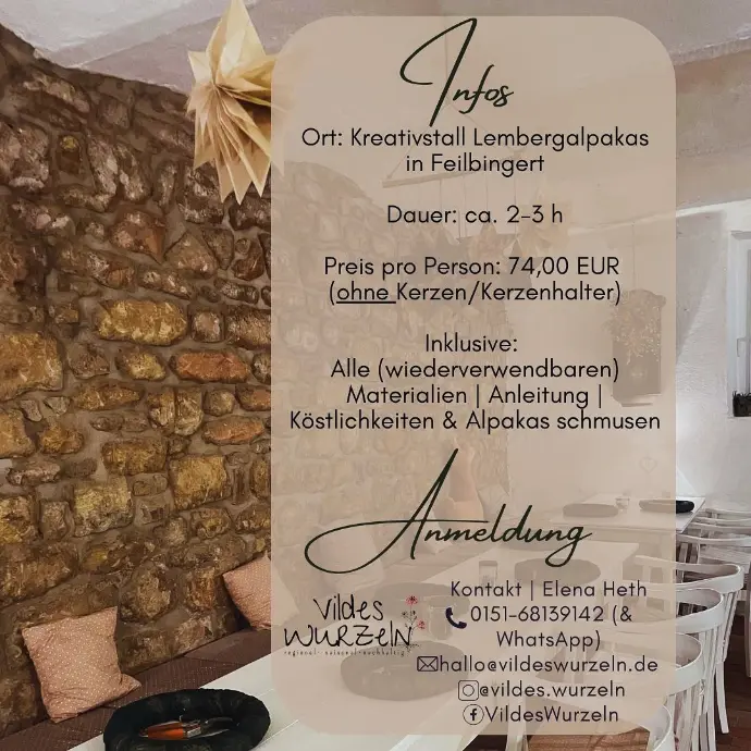 Für eine Anmeldung zum Kreativworkshop meldet euch gerne per Mail, WhatsApp oder telefonisch bei mir!